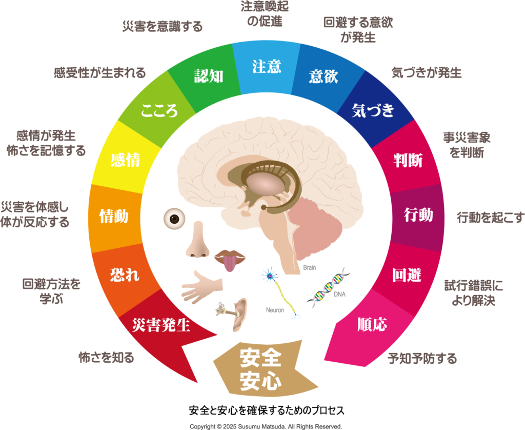 今回は、安全から安心へとつながるプロセスについて考えてみましょう。人々は日常生活を送る中で、災害は自分の身近な場所では起こらないと思い込み、心理的に災害のリスクを排除しています。そのため、身近なところで災害が発生すると、その危険性を認識し、恐怖を感じます。しかし、時間の経過とともに災害のことは忘れてしまいます。ある程度の時間が経つと、人々は災害を避けるようになるため、もはや恐怖を感じなくなります。重要な災害を忘れてしまうというこの性質は、脳の特性です。この仮説に基づき、人々の安全と安心を高めるための継続的な取り組みが必要です。安全を高めるためには、災害について学び、日常的に災害の回避策を模索する必要があります。災害を疑似体験することで、災害への恐怖を学び、それを維持するためのリスク感受性が高まることが示されています。実際に恐怖を体験することで、脳の記憶ニューロンやDNAに重要な情報が記録されます。