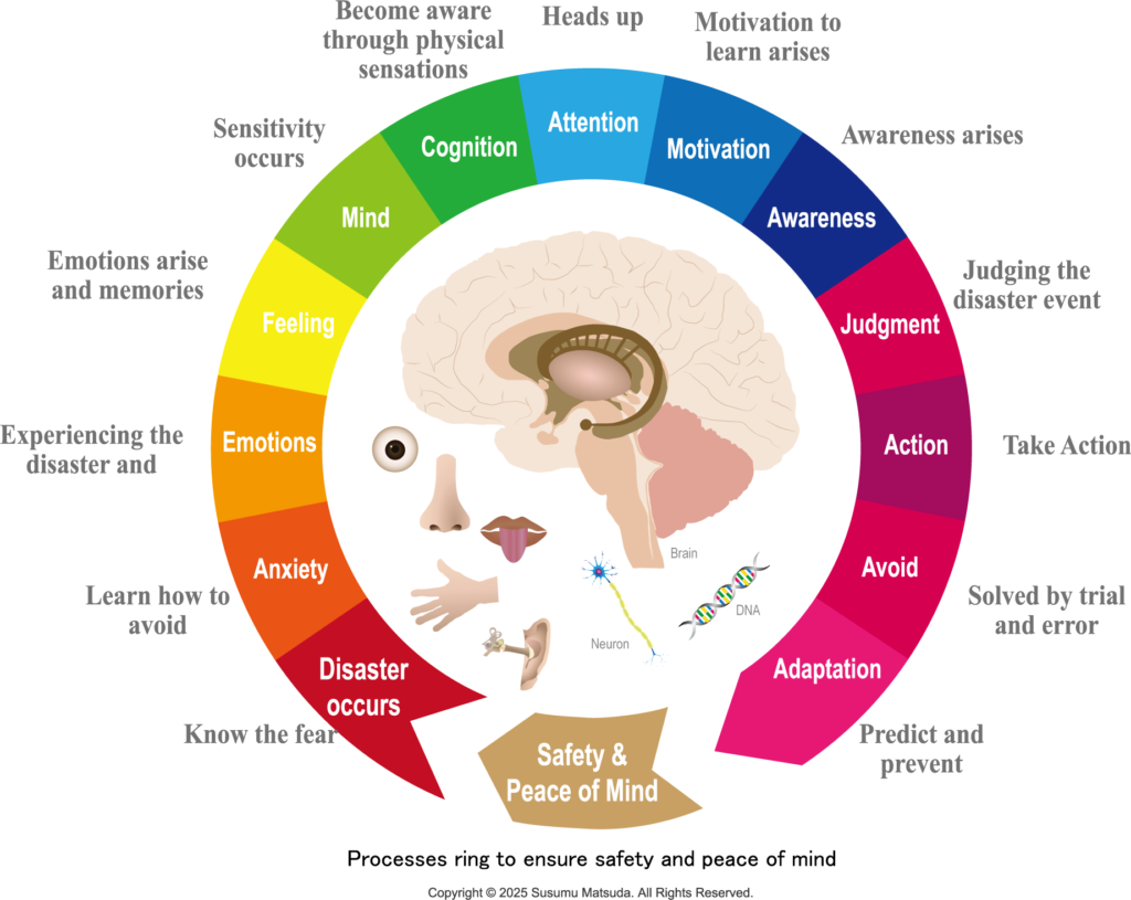 Let’s consider the process leading from safety to security. In our daily lives, people psychologically eliminate the risk of disasters, assuming that disasters will not occur in their immediate surroundings. Therefore, when a disaster occurs in our immediate surroundings, we recognize the danger and feel fear. However, over time, we forget about the disaster. After a certain amount of time has passed, people learn to avoid disasters and no longer feel fear. This tendency to forget important disasters is a characteristic of the brain. Based on this hypothesis, continuous efforts are needed to increase people’s safety and security. To increase safety, we need to learn about disasters and seek ways to avoid them on a daily basis. It has been shown that simulating a disaster increases risk sensitivity, which helps people learn to fear disasters and maintain that fear. Actual fearful experiences record important information in the brain’s memory neurons and DNA. Once risk sensitivity is enhanced, people consciously recognize and acknowledge disasters. Through these processes, true disaster vigilance becomes possible.