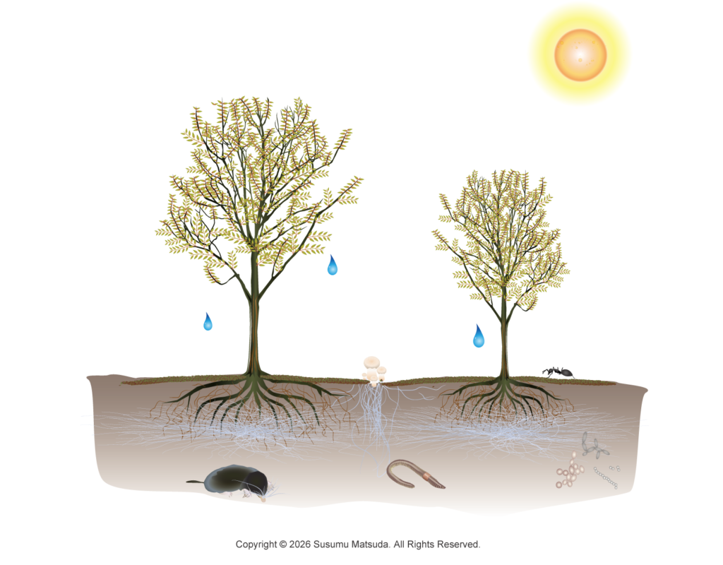 菌根を持った植物は、やがて地球で菌糸によりつながり合い、ネットワークを形成します。これにより森の地下には、菌根ネットワークが形成されるのです。菌根ネットワークは、複数の植物を菌糸で結びつけ栄養分が不足する植物に栄養を分け与えたり、生息に不可欠な情報を伝達する仕組みが有ることが判っています。このように菌糸ネットワークは、異なる種の植物を含め植物が共生する手助けをしています。天然の森が動植物を含め豊かに繁栄する仕組みとして菌糸ネットワークは機能しているようです。菌糸ネットワークを形成する菌糸は、菌を拡散する為にキノコを形成します。アカマツにはマツタケ、ミズナラにはマイタケが形成します。ただブナ科の生息数は減少傾向に有り、貴重な菌根ネットワークが減り続けているのが現状の様です。天然森の減少が環境に与える影響を考え天然林を維持しながら安心安全な社会を構築する事が大切だと思っています。
